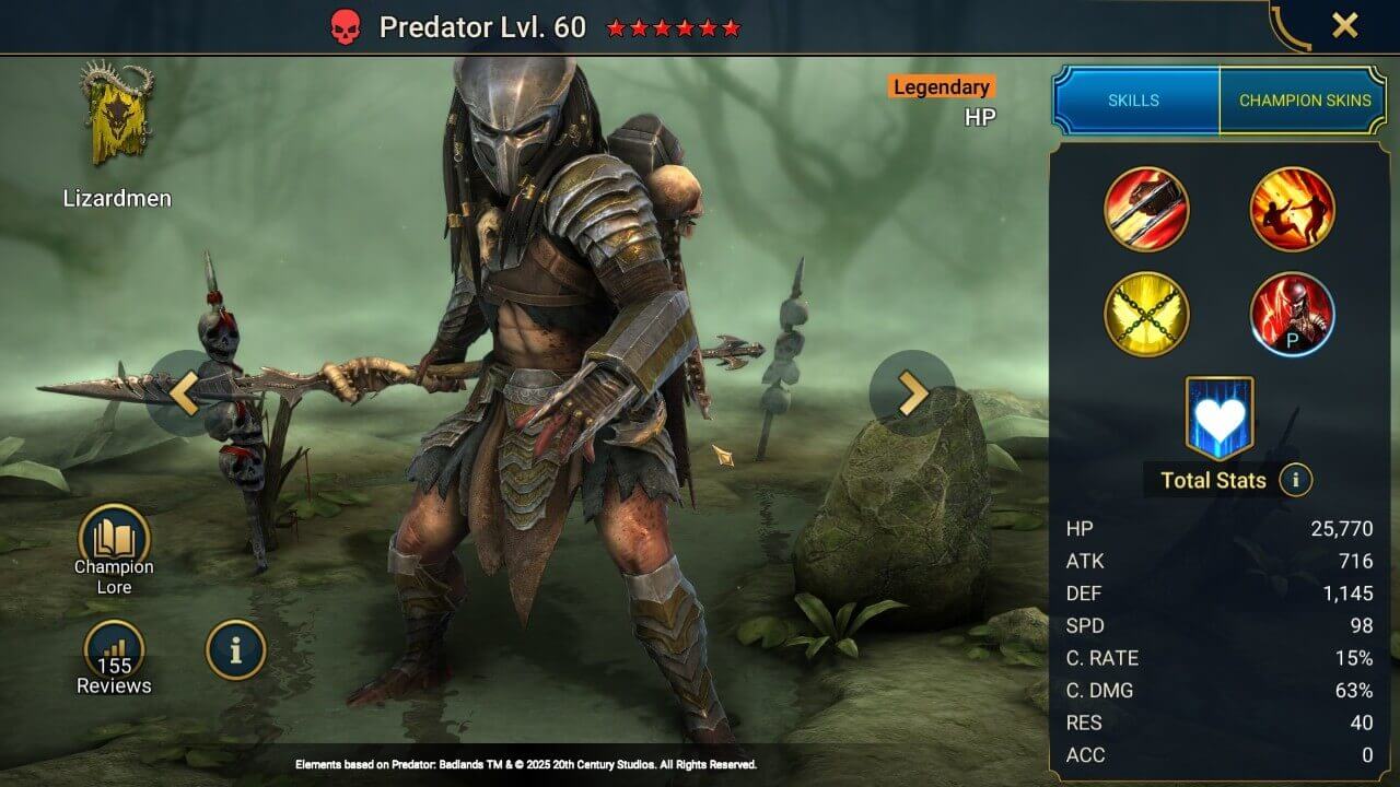 Predator is a strong HP-based champion who brings durability and sustain to the roster. Stack HP% and defense substats for maximum survivability. Speed keeps the champion cycling abilities frequently.