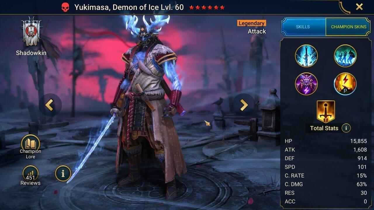 Yukimasa, Demon Of Ice deals heavy damage in Arena. Speed is king in Arena — go first or build tanky enough to survive the opener. Lethal/Savage sets maximize burst damage for nukers. Stoneskin dominates the defensive meta — build high resistance on defense teams.